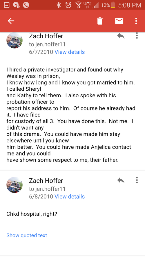 EMAILS WITH THE MOM about taking Anjelica out of state on her honeymoon with Hadsell and about his criminal history and recent release from prison.