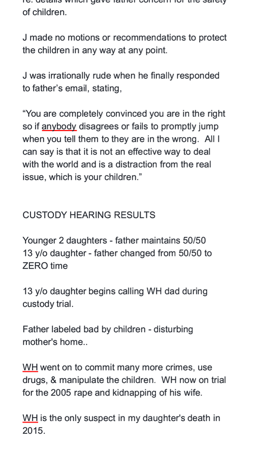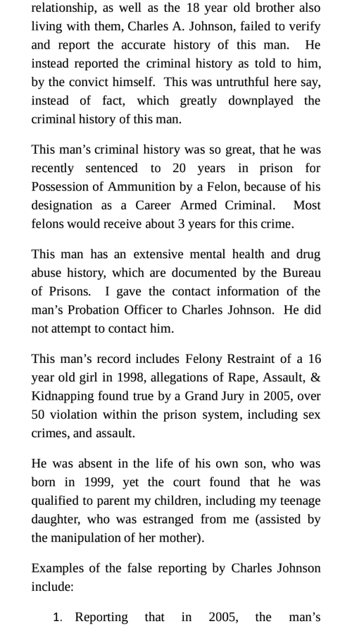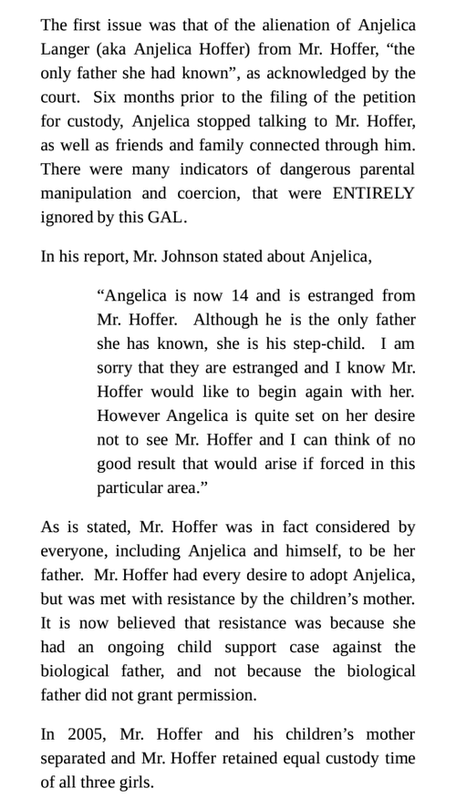 I went to family court in 2010, after Wesley Hadsell moved into my childrens' mother's home, in an effort to protect my children, especially my oldest daughter, then 13, who took a strong liking to the man and who had recently stopped living with me or communicating with me - stemming from tension that had erupted between her mother and I. This man had only been out of maximum security prison for 6 weeks when he met their mother. He moved into the home two weeks later. He had a very extensive criminal history, and was not an active father in his own son's life, yet the family courts determined he was safe to have full liberty with my daughters. I still had 50% custody of all three girls at the time. After the custody hearing with family court, I had ZERO custody of Anjelica - but still 50/50 of my other two daughters, age 7 & 9. This decision was made ENTIRELY on 'her desires', and disregarded my concerns for her safety and well-being.