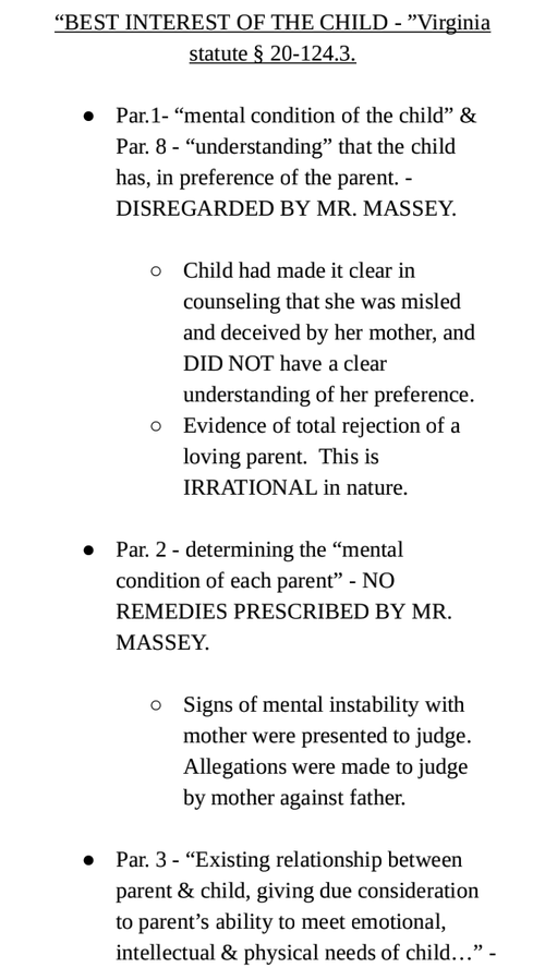 - The FAMILY LAW CODE of Virginia, specifically the "BEST INTEREST" list for consideration of custody, should include 'THE PEOPLE THAT A PARENT BRINGS AROUND THE CHILD'. There should be a list of qualities to consider, including - the length of time the parent has known the person, other 'similar' people brought around the children, character of the person, the way of meeting the person, amount of time that person is around the children, etc...