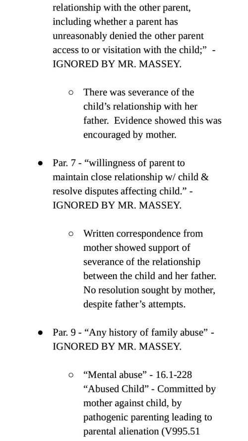 - The FAMILY LAW CODE of Virginia, specifically the "Best Interest" list for consideration of custody, should include 'THE PEOPLE THAT A PARENT BRINGS AROUND THE CHILD'. There should be a list of qualities to consider, including - the length of time the parent has known the person, other 'similar' people brought around the children, character of the person, the way of meeting the person, amount of time that person is around the children, etc...