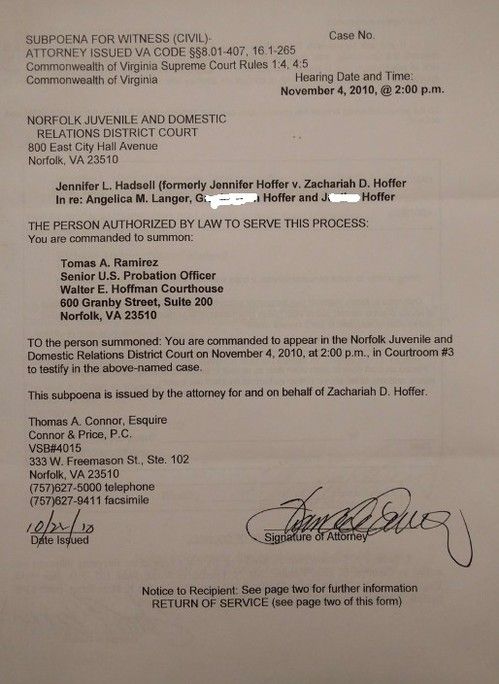On October 24, 2010 my lawyer sent a subpoena to the Probation Officer, Tomas Ramirez, so that he might testify as to Hadsell's criminal record.